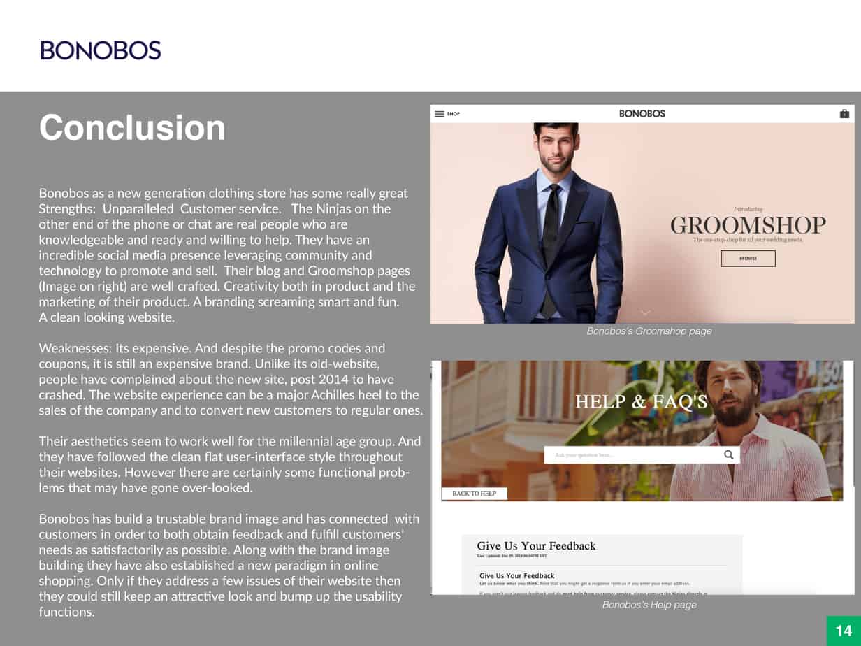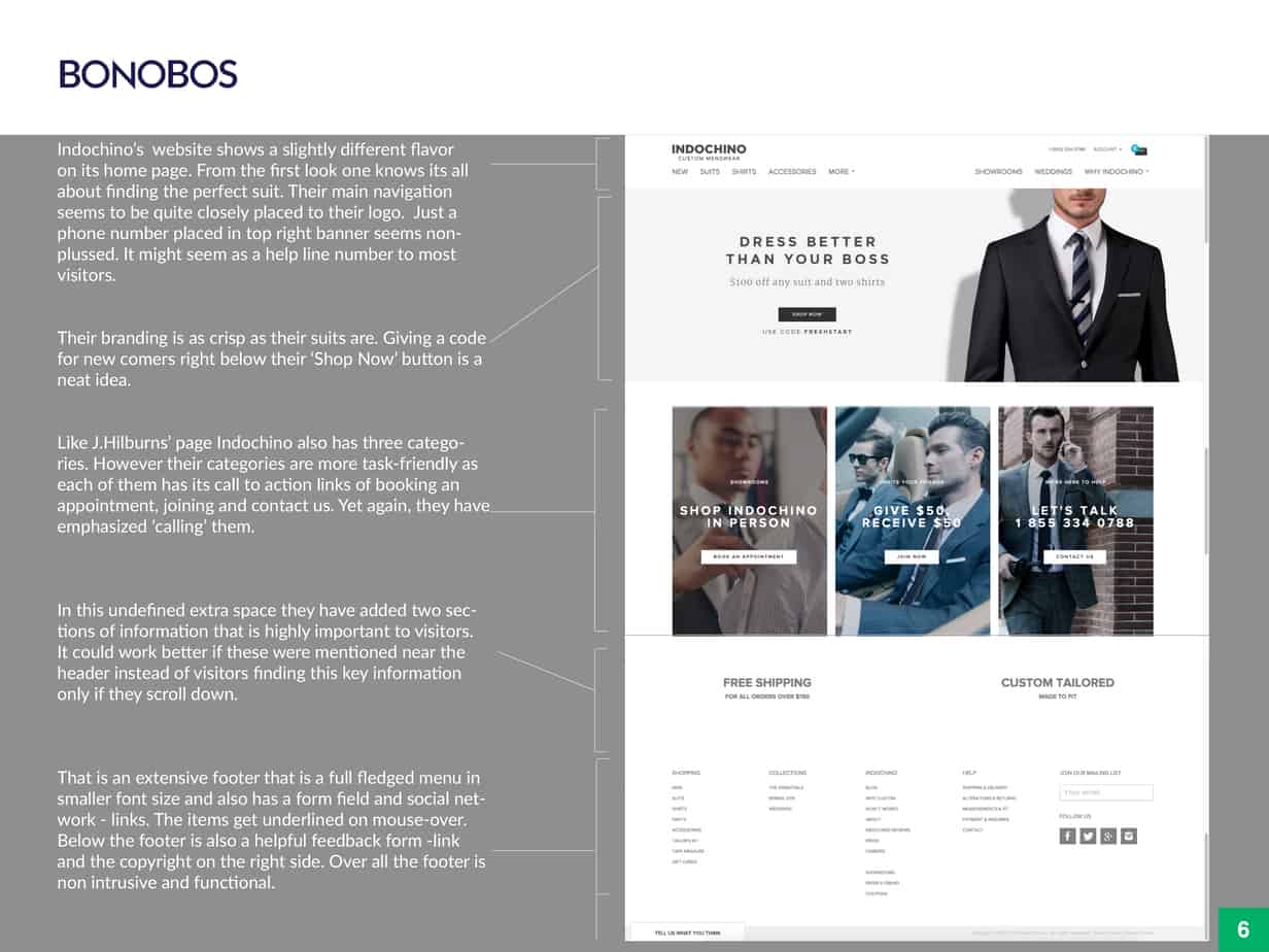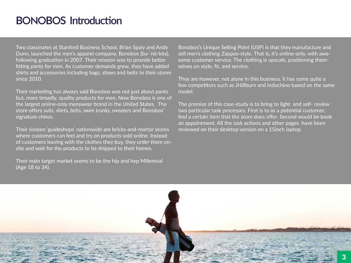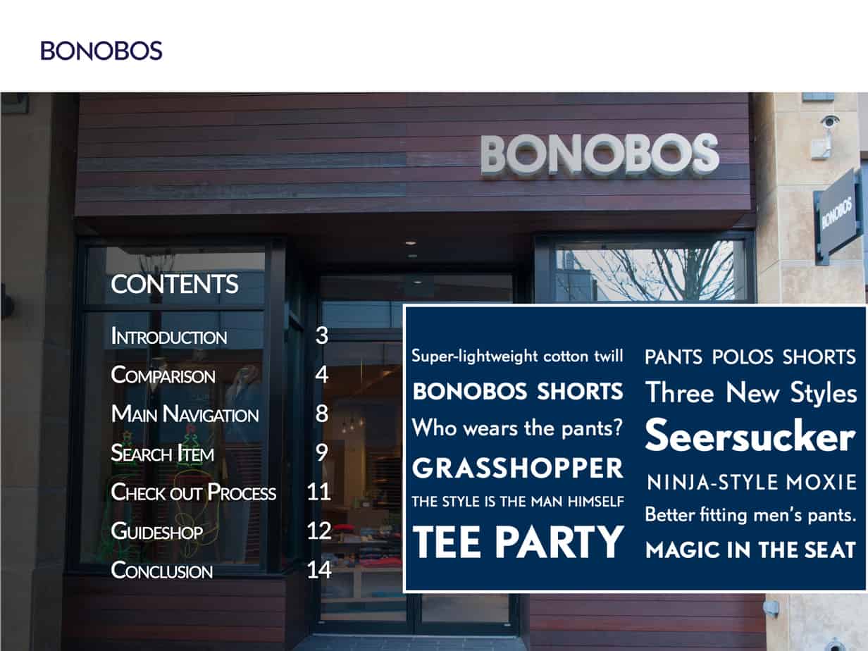 With this goal in mind, I set out to discover potential sources of stress and potential solutions. I explored three highend men’s attire e-commerce stores—namely Bonobos, Indochino and J.Hilburn—trying to find out what the experience was like. These stores share a similar business model of selling their merchandise online only despite having brick-and-mortar storefronts. I was most intrigued by the visually appealing, modern-day design of Bonobos.